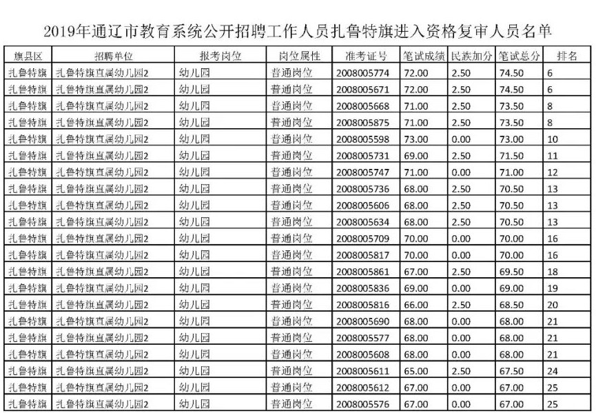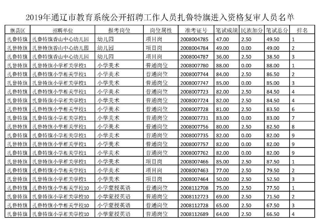 根據(jù)《2019年通遼市教育系統(tǒng)公開招聘工作人員簡章》的要求,現(xiàn)將報考扎魯特旗崗位進入資格復審人員名單進行公布。請進入資格復審的考生按照要求到扎魯特旗教育科技體育局進行資格復審,凡不在規(guī)定時間進行資格復審的,取消面試資格。具體要求如下: