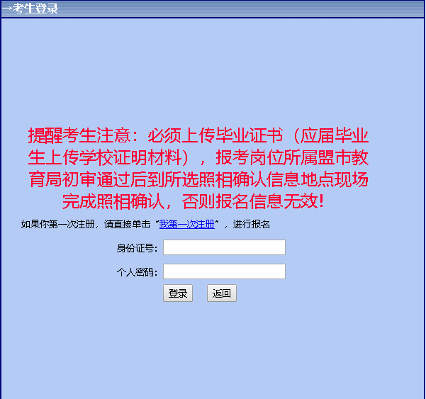 2.資格初審。網(wǎng)報期間,自治區(qū)教育招生考試中心通過網(wǎng)絡(luò)將報名人員信息分發(fā)到相應(yīng)招聘旗縣所在盟市的考試中心。盟市教育行政部門負責(zé)“特崗專項計劃教師”招聘工作的科室負責(zé)人必須到本地區(qū)教育招生考試中心對報名人員進行網(wǎng)上資格初審確認。從12月7日開始,報名人員可以從內(nèi)蒙古招生考試信息網(wǎng)打印準(zhǔn)考證。(具體方法 和注意事項詳見附件3)。