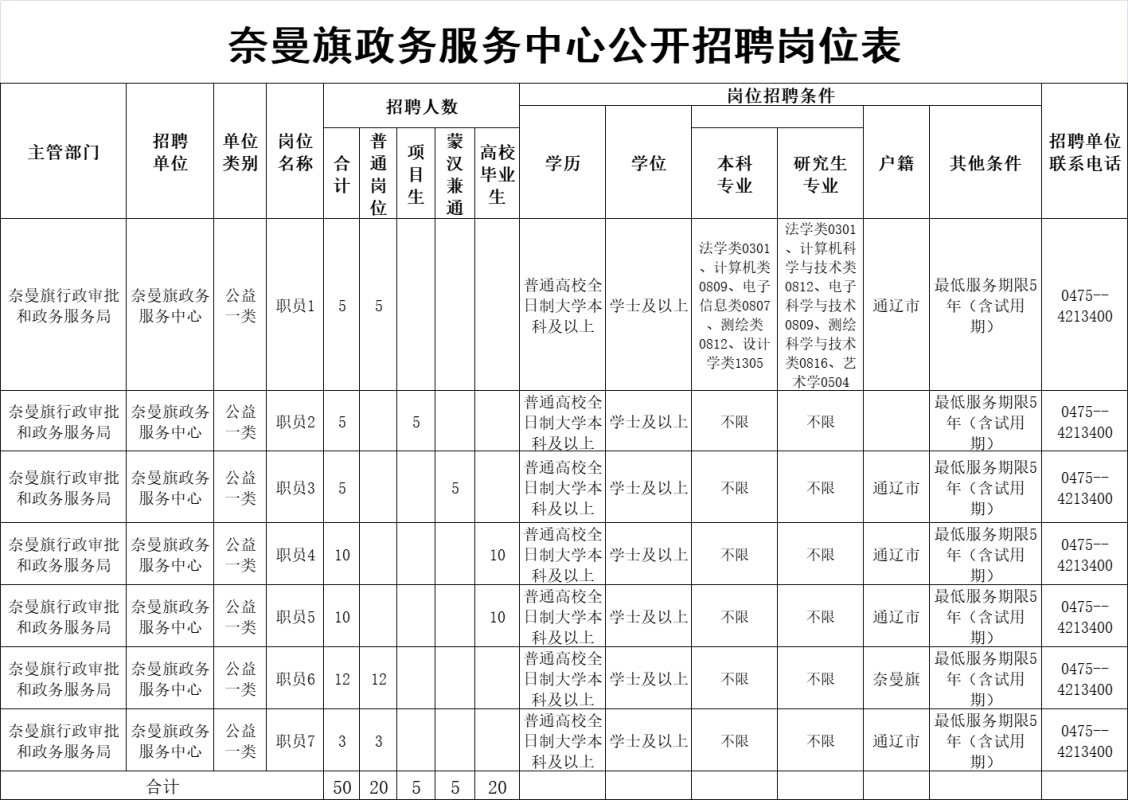(一)奈曼旗行政審批和政務服務局所屬事業(yè)單位政務服務中心公開招聘50名事業(yè)單位列編工作人員。
