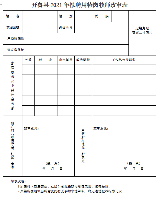 3.戶籍所在地或居住地轄區(qū)派出所出具的無(wú)違法違紀(jì)證明材料,出具部門(mén)填寫(xiě)意見(jiàn)并簽字蓋章(請(qǐng)待考察人員下載《開(kāi)魯縣2021年擬聘用特崗教師政審表》)。
