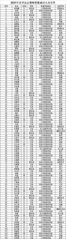 2021年春季開魯縣教育體育局受理的初中、小學(xué)和幼兒園教師資格認(rèn)定申請人共計193人,經(jīng)過網(wǎng)上報名、體檢、現(xiàn)場確認(rèn)、非師范類人員教育教學(xué)能力測試和考察等程序,認(rèn)定下列104名申請人符合申請的教師資格條件,現(xiàn)將通過人員名單予以公示(名單附后)。請通過人員于2021年7月26日后攜帶本人身份證到開魯縣教育體育局人事股315室領(lǐng)取。