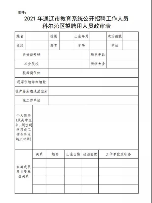 1.在職人員提供《干部人事檔案》,無業(yè)人員提供《學(xué)籍檔案》。3.居住地所在社區(qū)(村委會(huì))和戶籍所在地或居住地轄區(qū)派出所出具的無違法違紀(jì)證明材料,需下載附件《政審表》(此表正反面打?。鼍卟块T填寫意見并簽字蓋章。4.提供中國(guó)人民銀行出具的《個(gè)人征信報(bào)告》。5.憑所在院系出具的證明參加資格審核的2021年應(yīng)屆高校畢業(yè)生,須提供畢業(yè)證、學(xué)位證、教師資格證原件及復(fù)印件。6.《教師資格認(rèn)定申請(qǐng)表》原件。1.考察組審核擬聘用人員提供的學(xué)籍檔案(或人事檔案)及相關(guān)證件,了解被考核對(duì)象報(bào)名以來所提供的各類證件、經(jīng)歷是否真實(shí)有效、符合崗位要求。2.通過《政審表》《個(gè)人征信報(bào)告》了解其學(xué)習(xí)工作表現(xiàn)和遵紀(jì)守法等方面的實(shí)際情況。1.考察工作須本人攜帶相關(guān)材料到考察地點(diǎn)現(xiàn)場(chǎng)進(jìn)行,未在指定日期內(nèi)提交考察材料,視為自動(dòng)放棄錄用。2.需要給檔案存放部門致函提取檔案的人員,本人可在8月2日至4日工作時(shí)間內(nèi)持有效二代身份證到區(qū)教體局401辦公室,可配合出具借(調(diào))檔函。附件:2021年通遼市教育系統(tǒng)公開招聘工作人員科爾沁區(qū)相關(guān)崗位政審表
