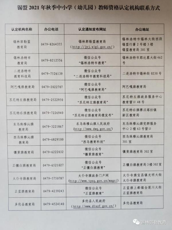 根據(jù)《內(nèi)蒙古自治區(qū)教育廳2021年秋季教師資格認定公告》要求和錫林郭勒盟教師資格認定工作安排,現(xiàn)就錫林郭勒盟2021年秋季中小學(幼兒園)教師資格認定工作有關事宜公告如下:
