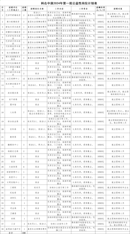 為進一步落實就業(yè)困難人員就業(yè)工作,有效促進就業(yè)困難人員就業(yè),根據(jù)內(nèi)蒙古自治區(qū)人力資源和社會保障廳《關(guān)于進一步做好公益性崗位開發(fā)管理有關(guān)工作的通知》(內(nèi)人社辦發(fā)〔2020〕50號)、《關(guān)于印發(fā)〈內(nèi)蒙古自治區(qū)就業(yè)困難人員認定辦法〉的通知》(內(nèi)人社辦發(fā)〔2020〕58號)以及按照盟人社局關(guān)于印發(fā)《2024年度興安盟第一批公益性崗位開發(fā)計劃的通知》(興人社辦發(fā)〔2024〕59號)文件要求,結(jié)合我旗實際情況,現(xiàn)面向社會公開招聘公益性崗位100人,具體事宜公告如下: